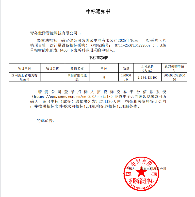 近日,青岛世泽智能科技有限公司(以下简称“世泽智能”)传来重磅喜讯,经过国家电网有限公司依法公开招标的严格遴选,公司凭借过硬的产品品质、雄厚的技术实力及完善的服务保障,成功中标国家电网有限公司2025年第三十一批采购(营销项目第一次计量设备招标采购)项目(招标编号:0711-250TL04222007),成为A级单相费控智能电能表包60的指定中标人,再度彰显公司在电力计量领域的核心竞争力。